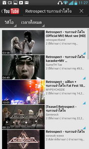 In music player. Show album art (if available), song title, artist name at the top with the search button MV music from Youtube, the play through SmartShare, the players shuffle, replay button the bottom button on a favorite song, the show list. The song was played, the time delay is adjustable, volume keys, music keys (rewind, play - pause, skip), the opening for the headphone jack Dalby Mobile only.